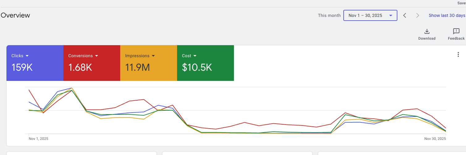 Just the month of November 2025 alone, $10,500+ was spend across multiple account been managed on Google For Both E-commerce and Service Based Businesses.