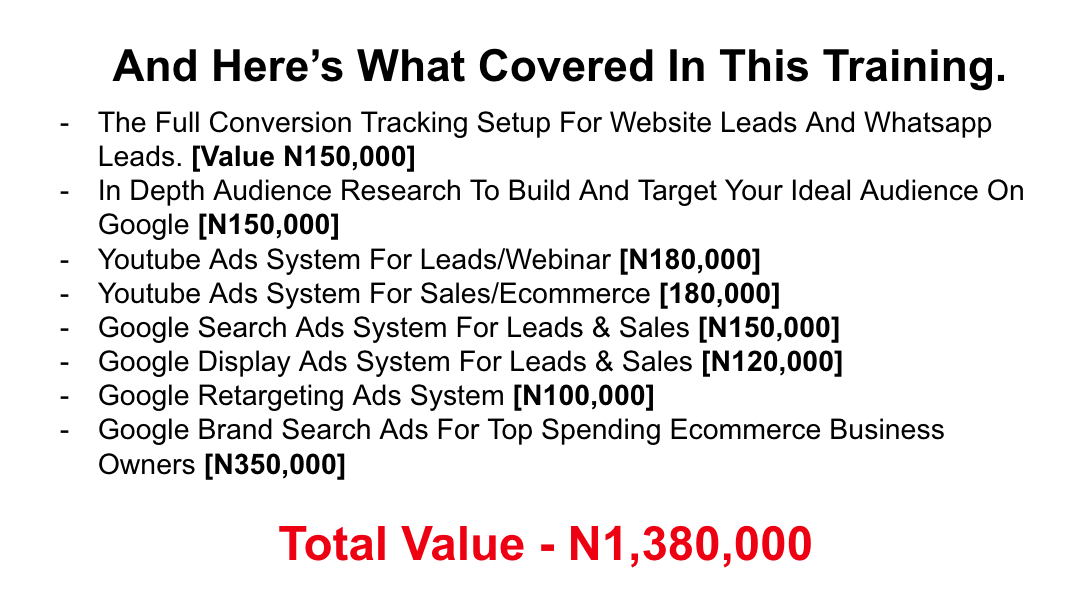 This is one of my previous google ads training program i created for realtors which sells for N100,000. It focuses on real estate agents and how they can use google ads for their business. You will be receiving access to this training for free.